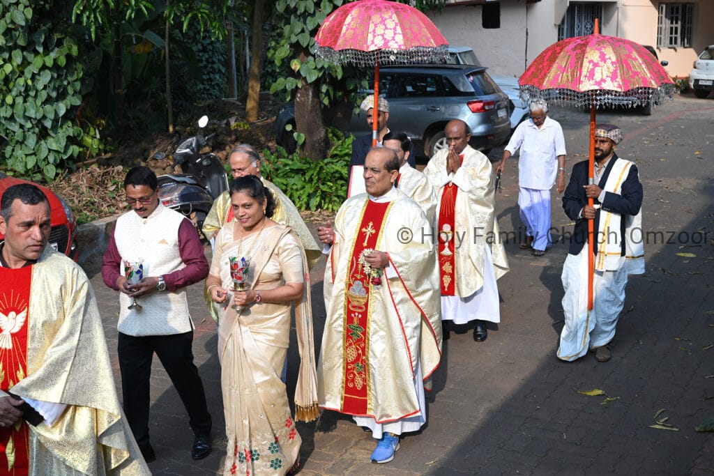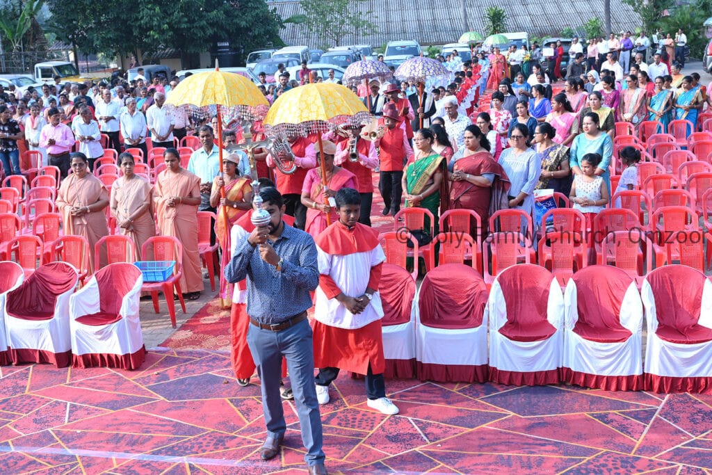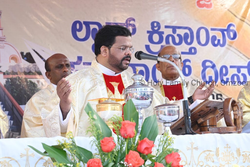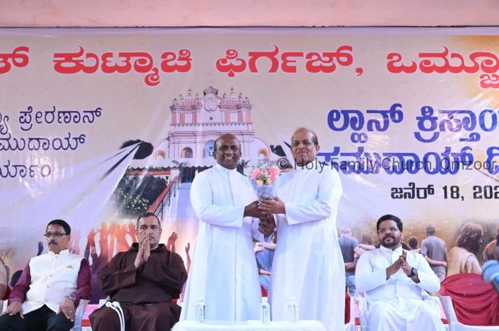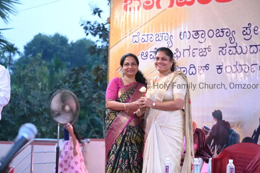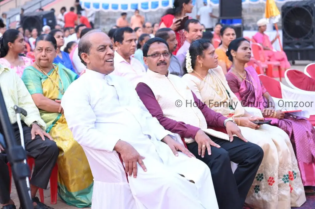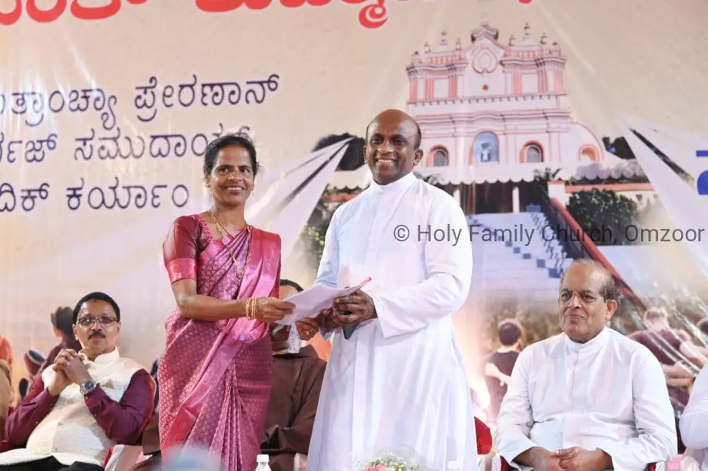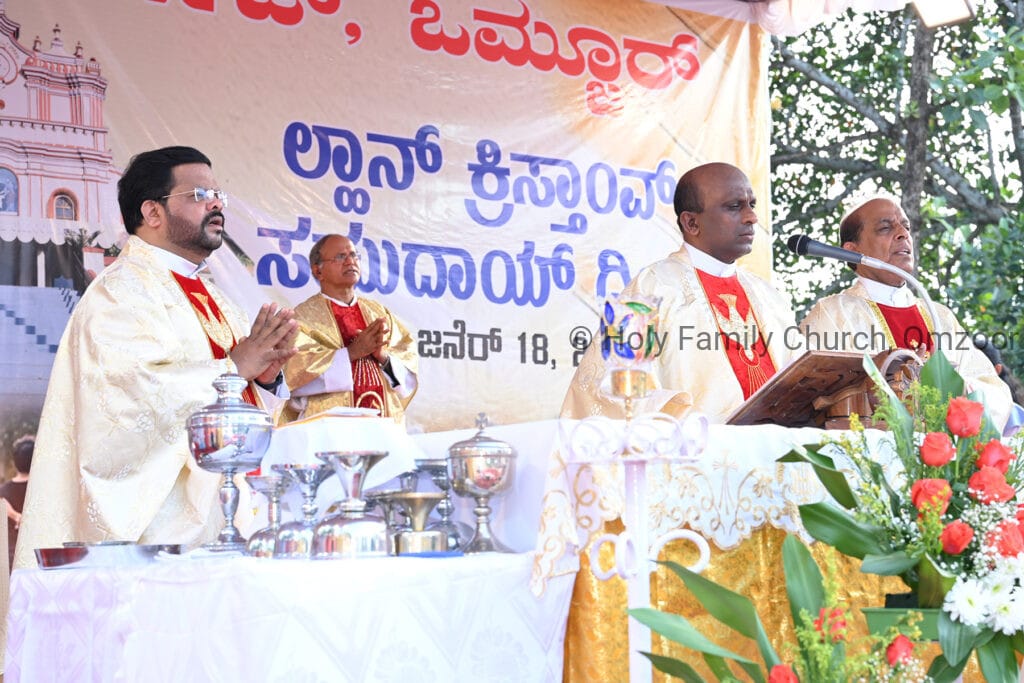 The Holy Mass was presided over by Fr Sunil George D’Souza, director of the Small Christian Community, Mangalore diocese. He was assisted by Fr William Menezes, parish priest of Holy Family Church, Omzoor, Fr Victor D’Souza, resident priest of the parish, Fr Robert Lasrado and Fr Jerald OMF Cap, as co-celebrants. Their presence added grace and solemnity to the occasion.